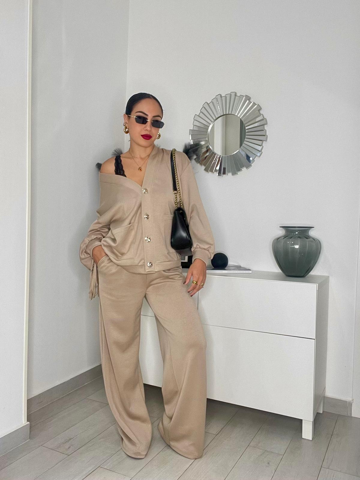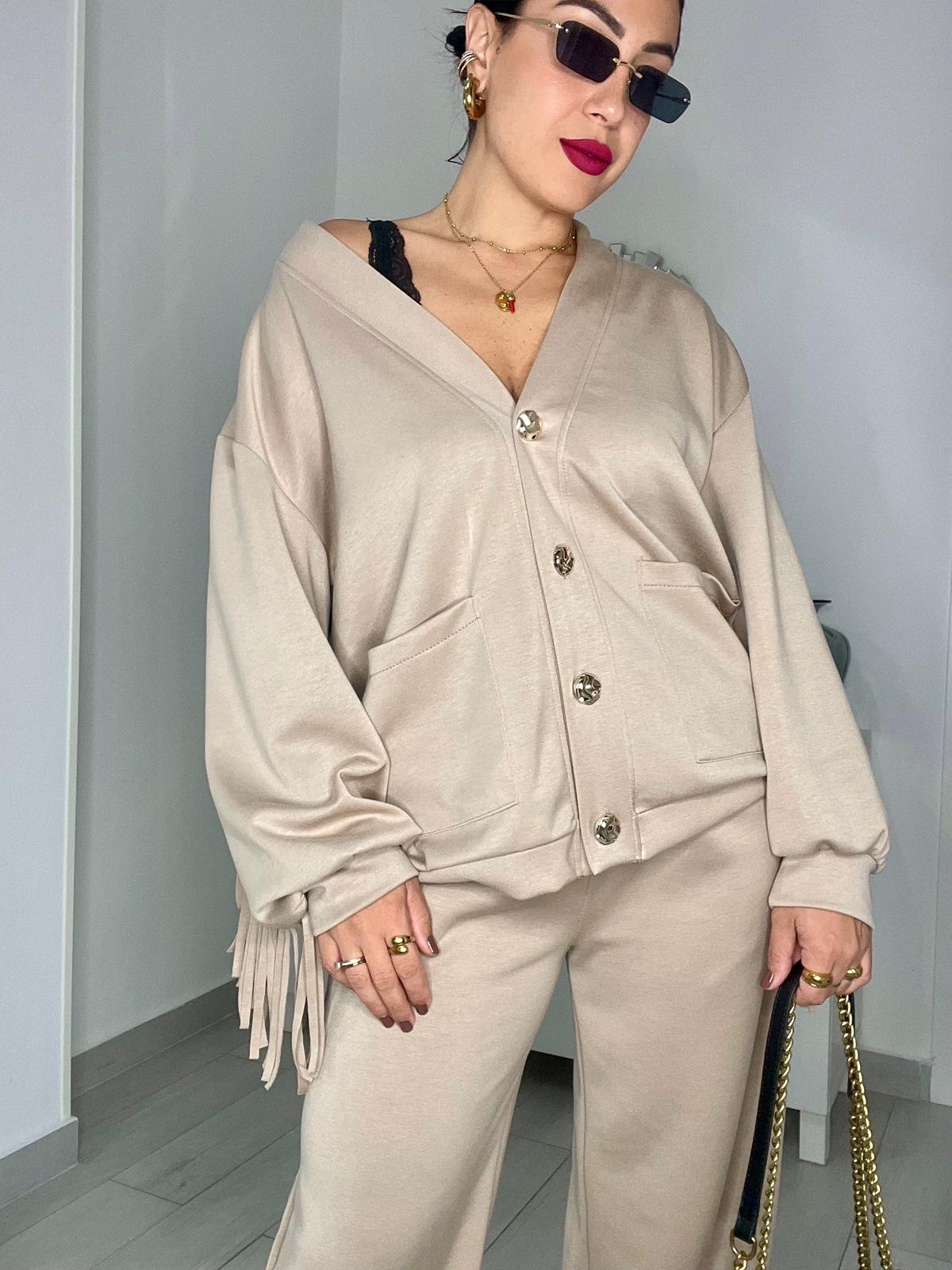 Coordinato composto da pantaloni wide leg con elastico in vita e cardigan con bottoni dorati e frange sul retro.