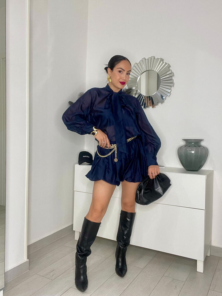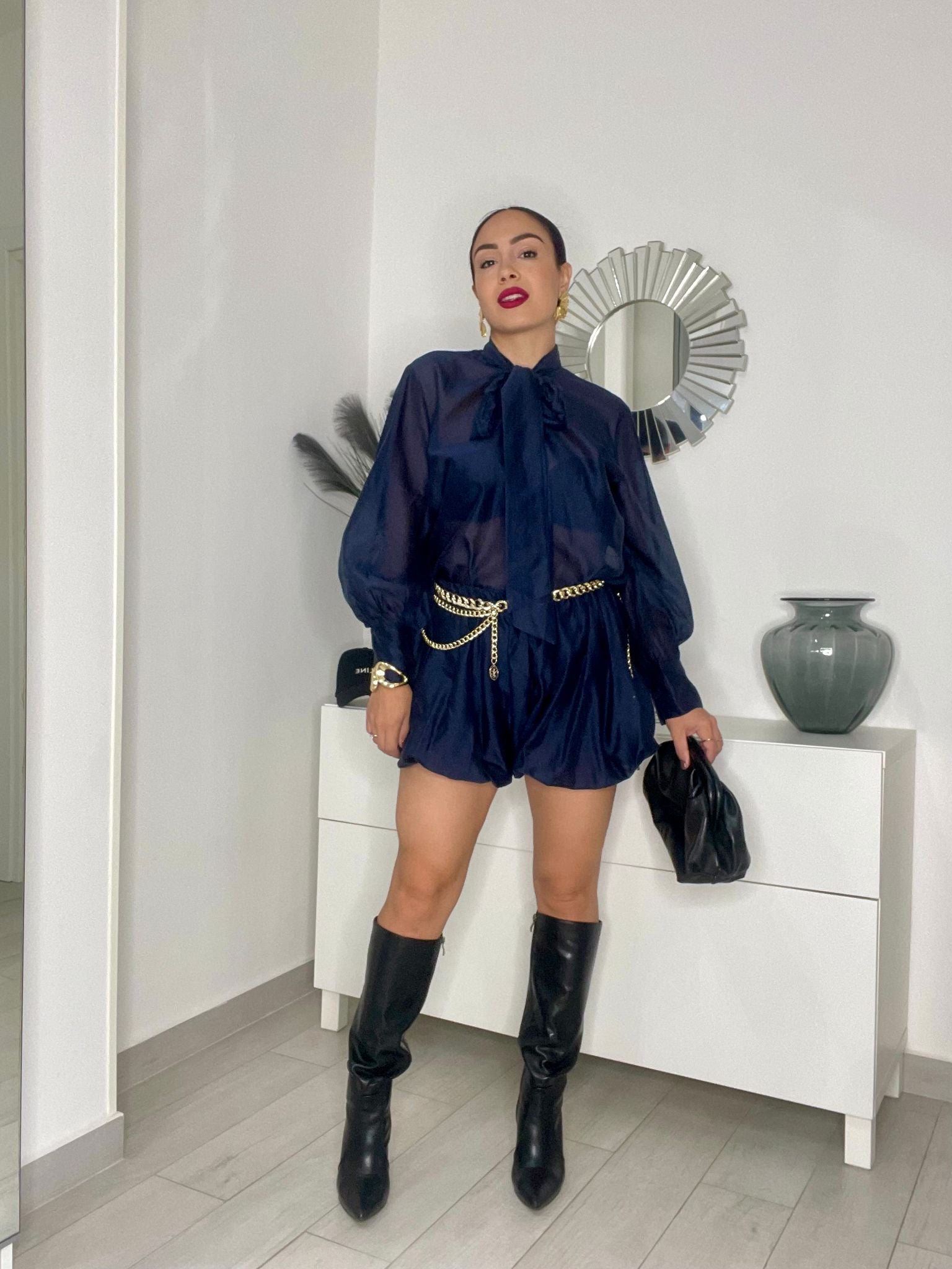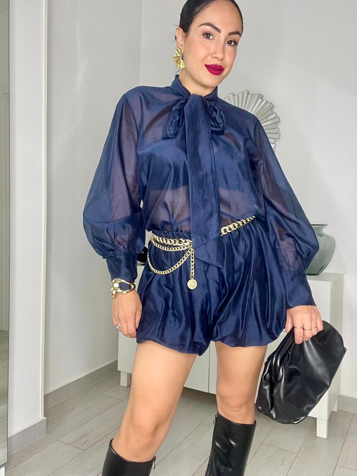 Coordinato composto da shorts balloon e blusa con fiocco.