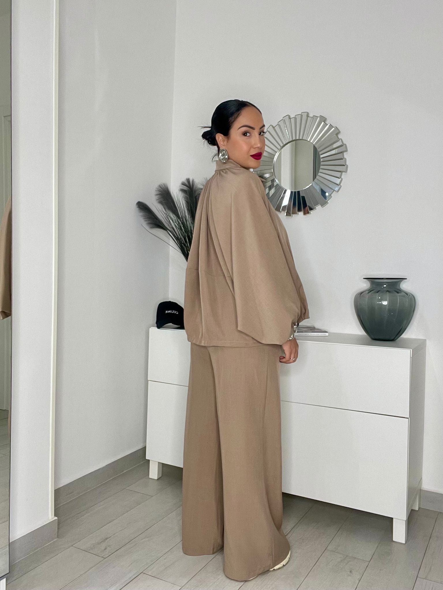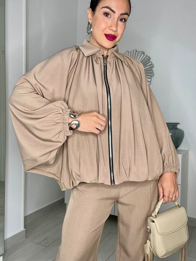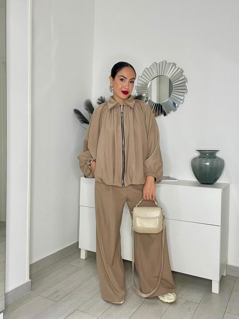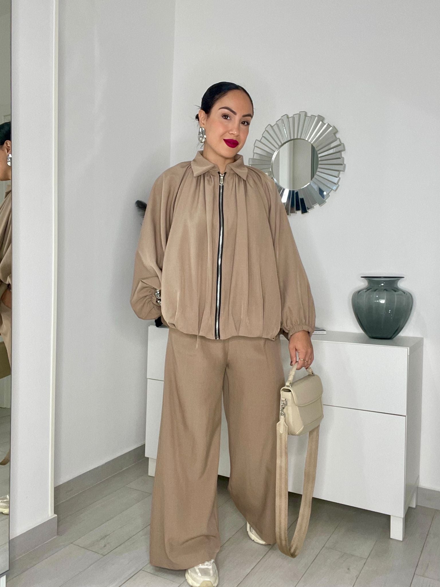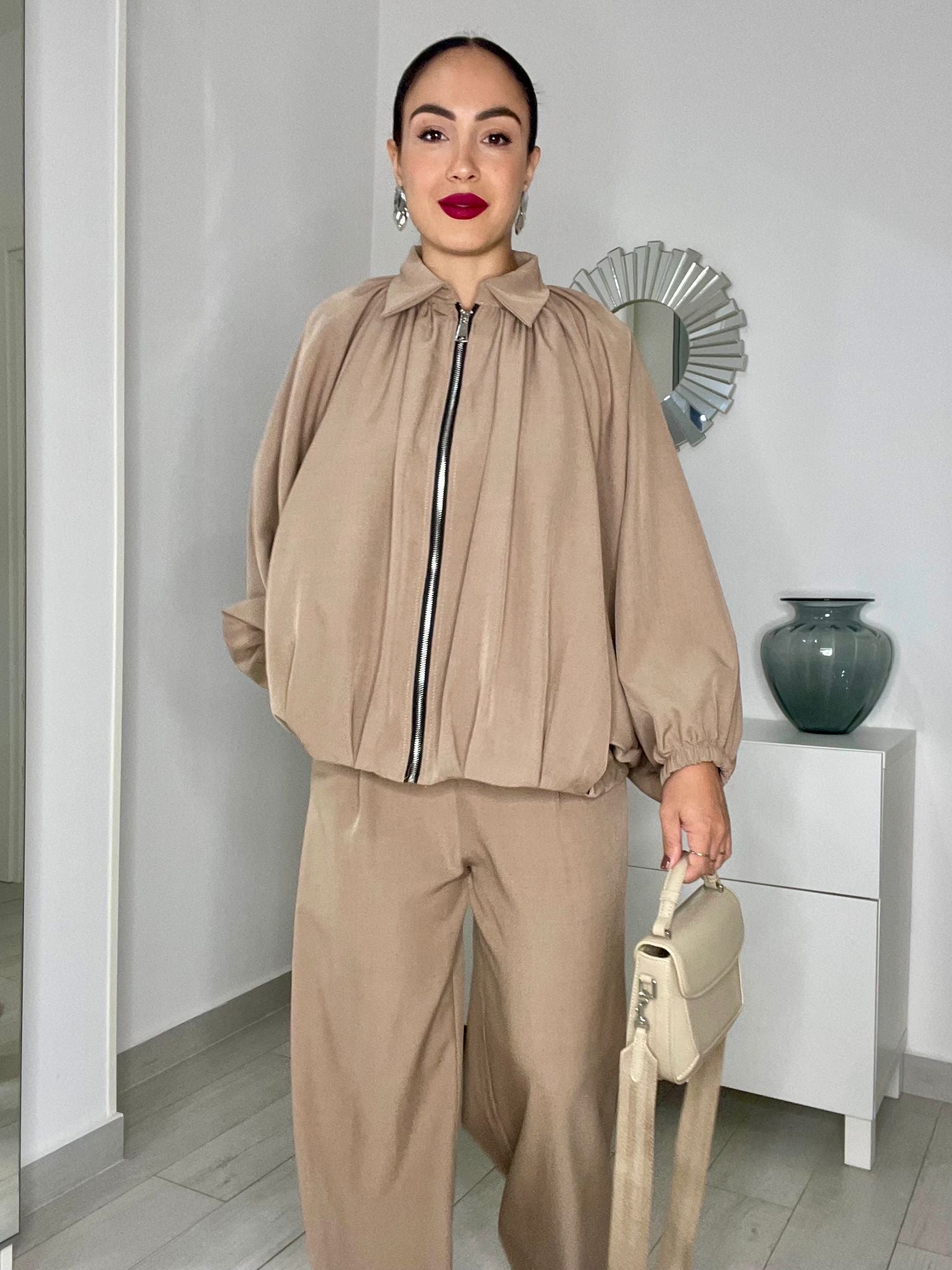 Coordinato composto da pantaloni wide leg con elastico sul retro e giacca con zip.