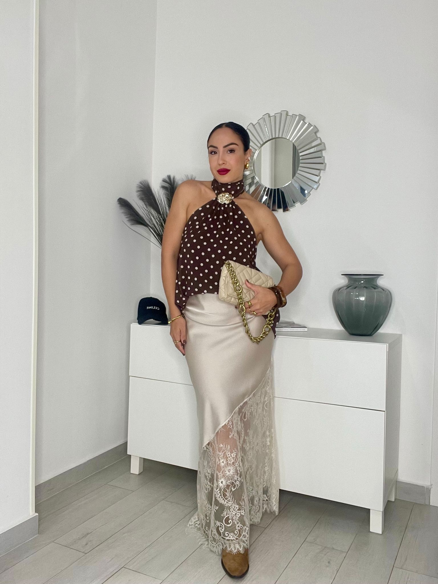 Gonna effetto raso con elastico in vita e fondo in pizzo asimmetrico.