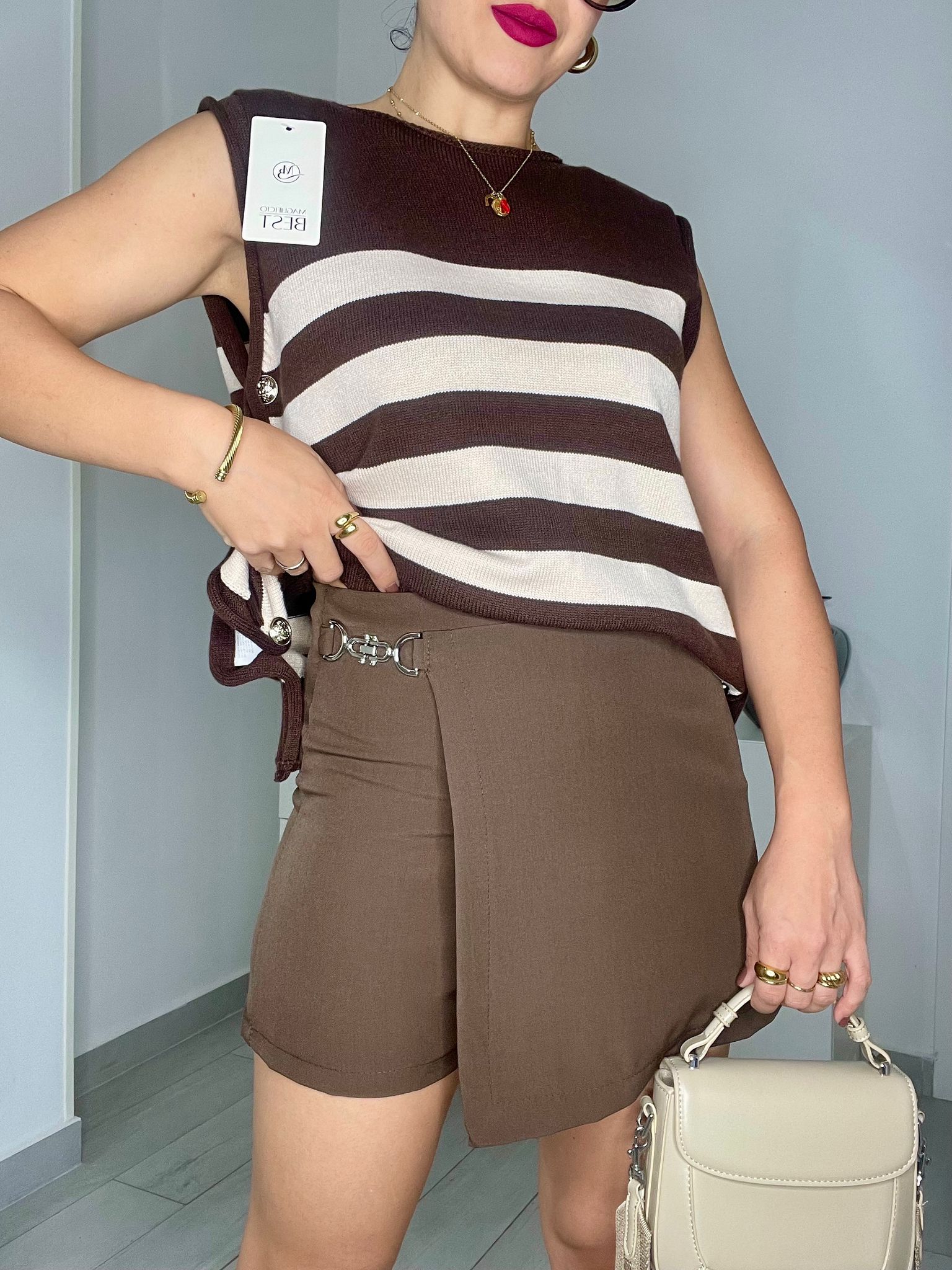 Pantagonna effetto portafoglio con gancetto e zip laterale.