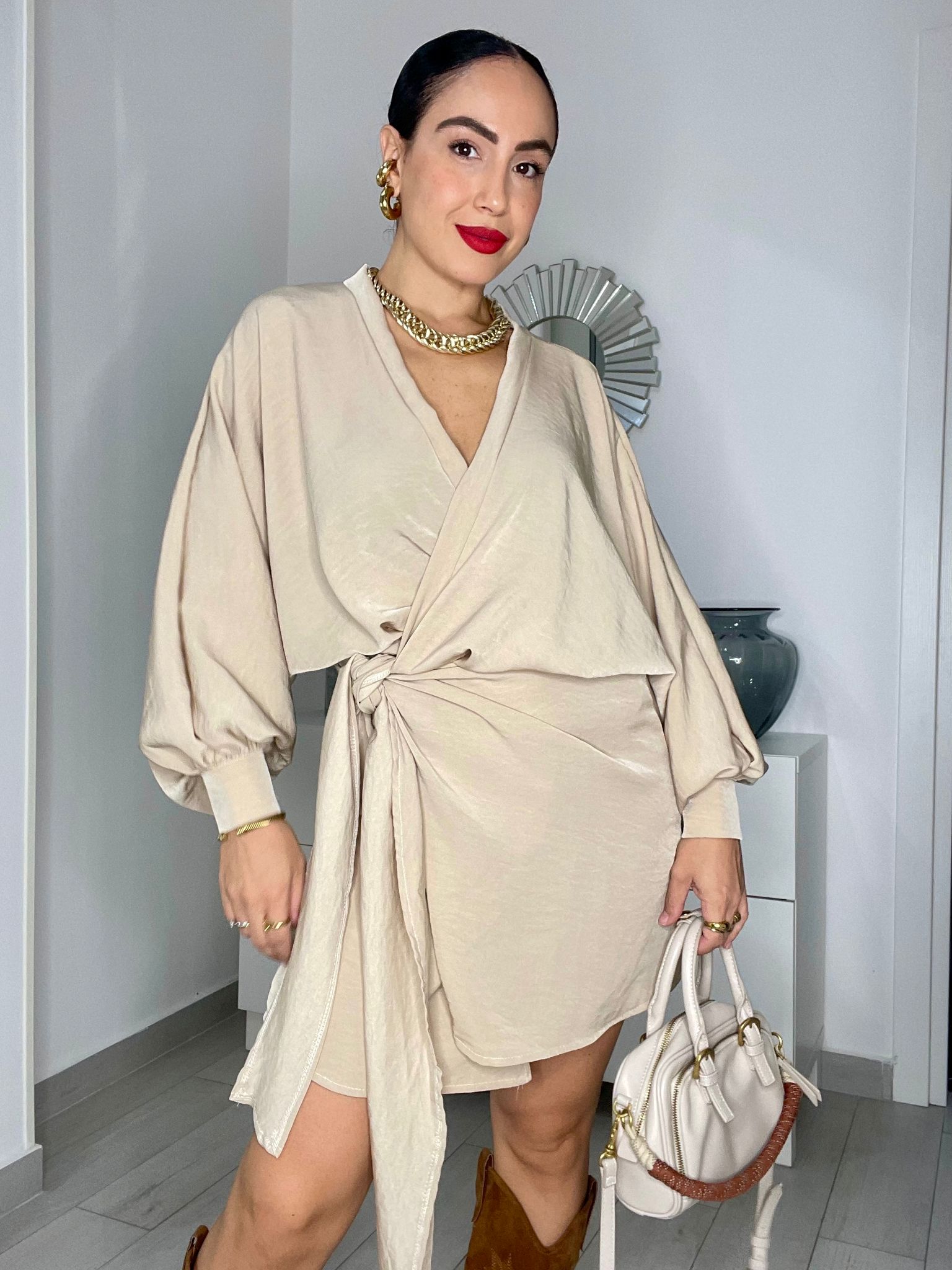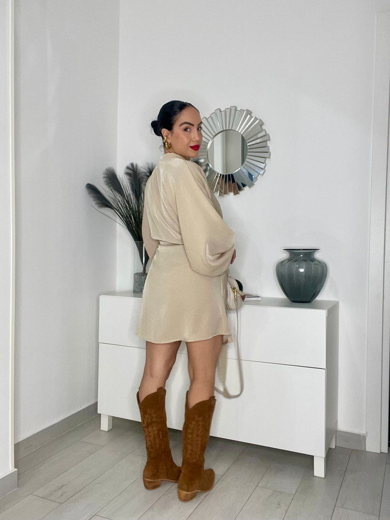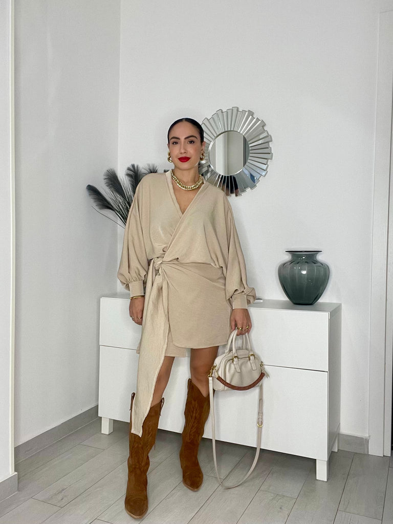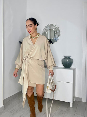 Abitino con manica ampia, chiusura a portafoglio e fusciacca laterale.