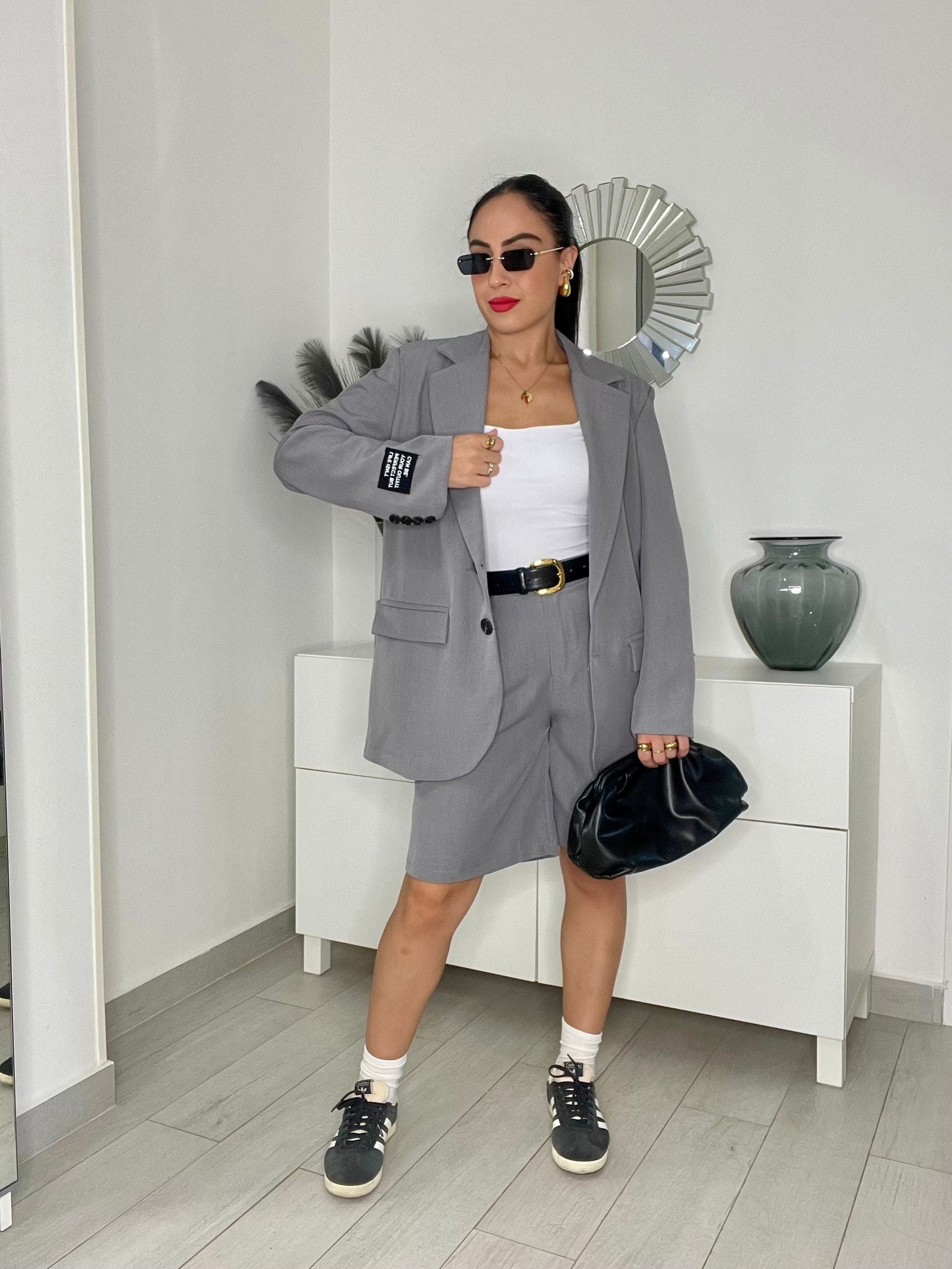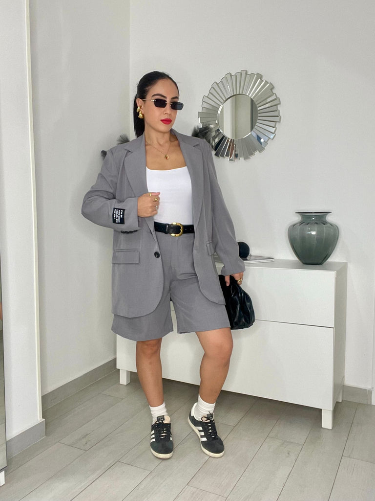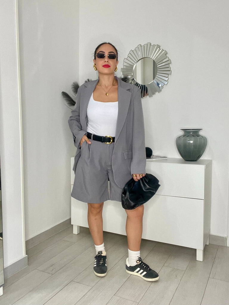 Tailleur composto da bermuda con elastico sul retro e blazer oversize.