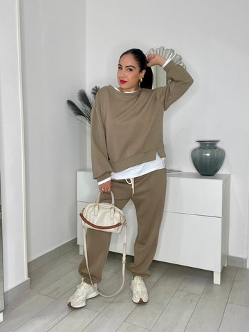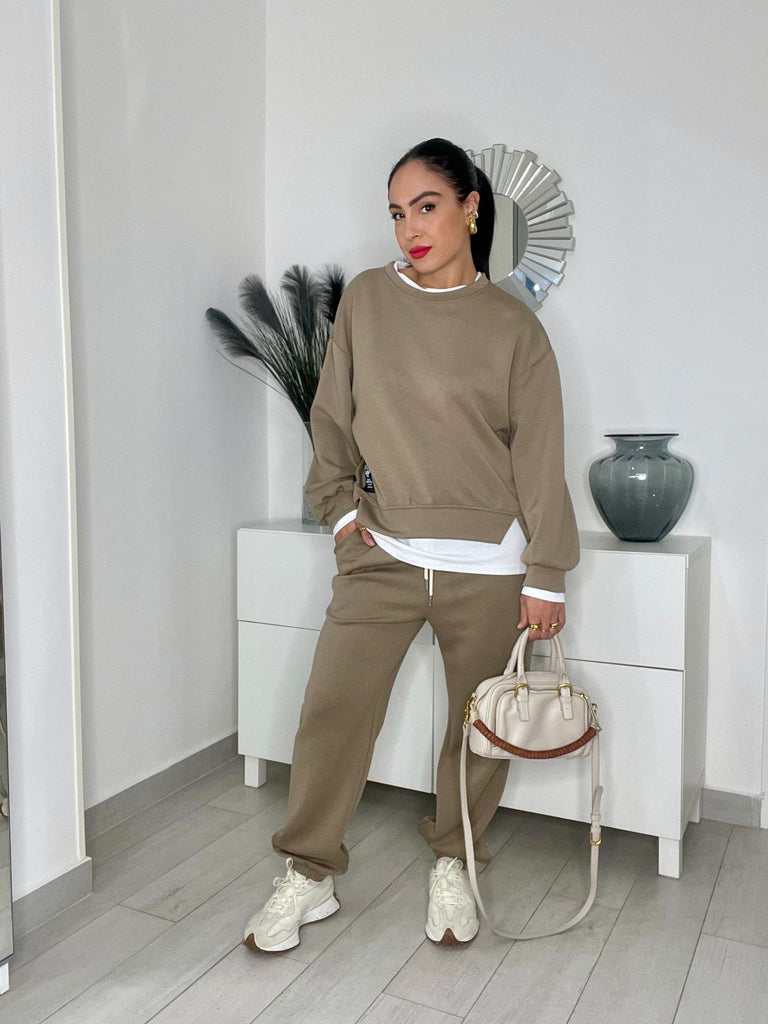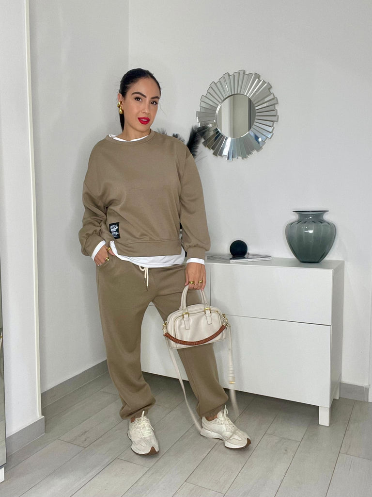Coordinato tuta composto da felpa con t-shirt incorporata e pantaloni con coulisse in vita ed elastico alla caviglia.